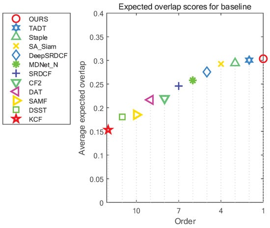 We selected 11 trackers, including TADT [], Staple [], SA-Siam [], DeepSRDCF [], MDNet [], SRDCF [], CF2 [], DAT [], SAMF [], DSST [], KCF []. To ensure a fair comparison, the results of the other algorithms were downloaded from the VOT-2016 official website. Figure 12 shows the EAO ranking results, and it can be seen that our tracker outperforms TADT, which is innovative in feature modeling, and is in the first position. Table 3 shows more detailed comparison information, including EAO score, OP score and Failures score, and our tracker is in the leading position in all three metrics.