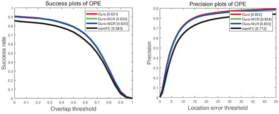 We separately tested two modules on OTB100, and the results are shown in the figure below. It is easy to see that the effect of a single module is not as good as that of two modules acting at the same time. Figure 13 compares success rate and precision rate for these variations in the OTB100 benchmark, where WLR and WCR modules achieved a 63.0% and 83.3%, and 63.0% and 83.4% success rate and precision rate, respectively. Therefore, combining the two reliability modules can achieve the best performance. This is also a significant improvement compared to the baseline tracker SiamFC.