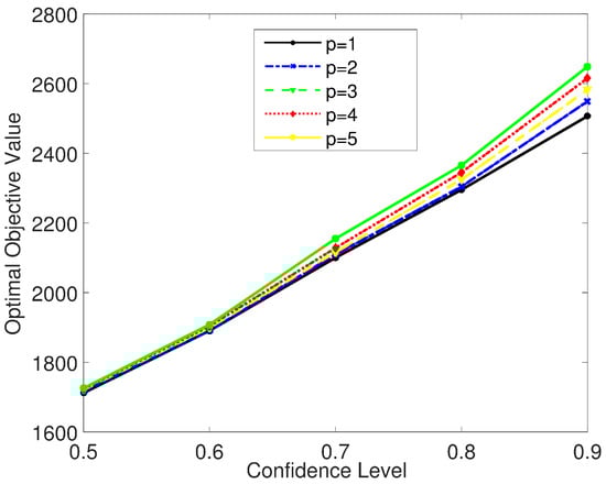 From these five gradual rising lines, we can find that the optimal total cost rises with the increase in service level gradually at the same overproduction cost, which implies that there is a reciprocal relationship between the total cost and service level, alerting the decision makers to handle this conflict reasonably. In addition, from the look of the whole figure, we can also find that the bigger the value of the overproduction cost, the larger the increasing range of the optimal objective value with the increase in service level. This plays a large role in revealing that a bigger overproduction cost will lead to a faster speed at which the total cost increases with the service level, especially the higher service level. Hence, the manufacturer should reasonably control the quantity and cost of overproduction.