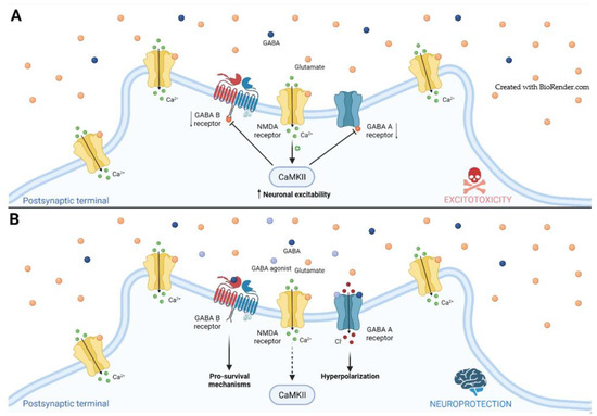 Glutamate-mediated excitotoxicity in ischemic stroke. (A) Following ischemic injury, the massive release of glutamate (orange spheres) leads to the entry of large amount of Ca2+, increasing neuronal excitability and activating the Ca2+/calmodulin-dependent protein kinase II (CaMKII). CaMKII phosphorylates both GABAA and GABAB receptors, decreasing their availability; (B) The potentiation of symmetric signaling through agonists (light-blue spheres) of either GABAA or GABAB receptor, or GABA itself (dark-blue spheres), counteracts the glutamate-mediated excitotoxicity by hyperpolarizing the neuron and activating pro-survival second messengers that altogether leads to neuroprotection.