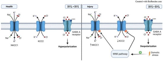 It has been well-documented that under some pathological conditions, [Cl−]i can be dysregulated, leading to a depolarizating effect mediated by GABAA receptors (Figure 2) []. This is primarily motivated by a high expression of NKCC1 and a low expression of KCC2, leading to a higher [Cl−]i compared to the extracellular concentration of chloride ([Cl−]e) [,,]. The main cellular cascade involved in the regulation of NKCC1 and KCC2 following osmotic stress (low [Cl−]i) is the With-No-Lysine (K) (WNK) pathway, which ultimately phosphorylates both NKCC1 and KCC2 with opposite outcomes: NKCC1 is activated whereas KCC2 is inhibited (Figure 2) [,].