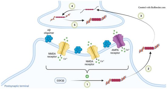 Another mechanism that can cause the misfolding of tau and subsequent formation of its pathogenic version is the extracellular deposition of Aβ []. A striking study from Fani and colleagues [] has shown that extracellular Aβ oligomers are able to principally activate extrasynaptic NMDARs, but also AMPARs to a lower extent. This is carried out by interacting with the lipid membrane that perturbs its mechanical properties, leading to alterations in the mechanosensitivity of receptors (Figure 3) []. Since GSK3β kinase can be activated by NMDARs [], it would not be strange to speculate that this mechanosensitivity-mediated activation of NMDARs can increase GSK3β activity and promote tau hyperphosphorylation (Figure 3). In fact, GSK3β kinase is also the main factor connecting extracellular Aβ with intracellular tau since the inhibition of GSK3β blocks the increase in phosphorylated tau and therefore prevents the Aβ-induced impairment of LTP [,]. Similarly to what is described above, treatments with Aβ oligomers enlarge the dendritic/synaptic location of phosphorylated tau [], but only when tau it is already phosphorylated []. Other kinases can be also implicated in the aberrant function of tau induced by Aβ. For example, Wu et al. [] obtained proteomic data suggesting that Aβ activates cyclin-dependent kinase 5 (CDK5) which eventually phosphorylates tau at synaptic sites.