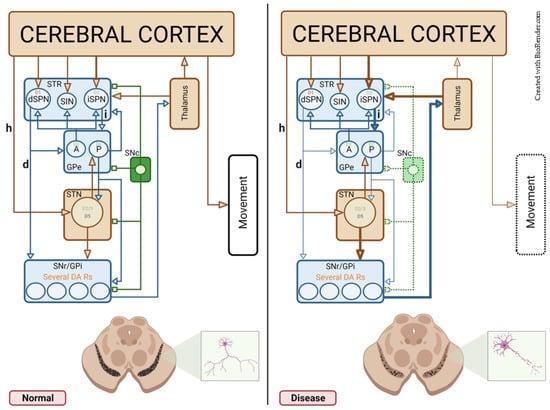 Basal ganglia network in normal condition and its changes during PD. (Normal) In the healthy brain, cortical asymmetric inputs activates both GABAergic (blue) and glutamatergic (brown) neurons in the STR and STN, respectively. The information from cortical efferents to the SNr/GPi can be transmitted through 3 different ways: the direct (d), indirect (i), and hyperdirect (h). Then, the SNr/GPi regulates the outcome of downstream motor control areas. Dopaminergic projections (green) from the SNc modulate cellular activity through distinct DA receptors (DA Rs). (Disease) Following the degeneration of DAergic neurons, there is an imbalance due to the hyperactivity of the indirect pathway and the hypoactivity of the direct pathway, leading to the disinhibition of both the STN and GPi/SNr (red), and resulting in an enhanced inhibition of downstream motor regions.