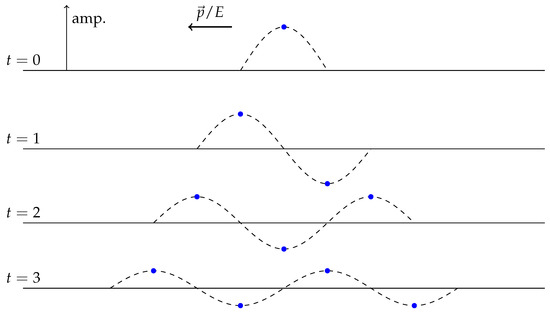 The wave function for the first four expansions is shown in Figure 1. We take the discretized picture of the sine function maxima and minima, the dots, with cosmological time .