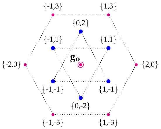 The Magic Star (MS) of shown in Figure 2 is obtained by projecting its roots on the plane of [28]. The pair of integers are the (Euclidean) scalar products and for each root . The fermions on the tips of the MS are quarks, since they are acted upon by : they are colored. The fermions within the center of the MS are leptons: they are colorless. A similar MS of within is obtained by projecting the roots in the center of the MS of on the plane of .