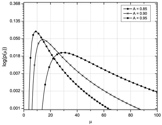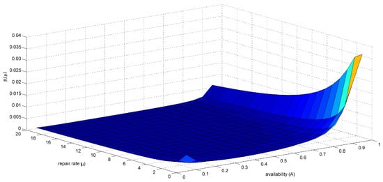 The graphic presentation of the dependence of the PDF of engine’s repair rate versus the repair rate, for a fixed value of the MTBF parameter and different values of availability parameter A, in logarithmic scale, is shown in Figure 1. The analysis of this dependence shows that the increase in parameter A results in smaller values of the PDF maximums reached for higher values of repair rate. It is obvious from Figure 1 that there is an envelope of the family of curves, which excludes the possibility that for some value of the variable, the PDF has a higher value than the envelope function for that same value.