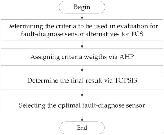 First of all, we should determine the criteria to be used in the evaluation of fault-diagnosis sensor alternatives. Here, the criteria should be defined by multidisciplinary knowledge (cost, efficiency, impact on the environment, safety, and so on). After that, we can assign criteria weights to the AHP method. Next, we can determine the final alternative evaluation result through the TOPSIS method.