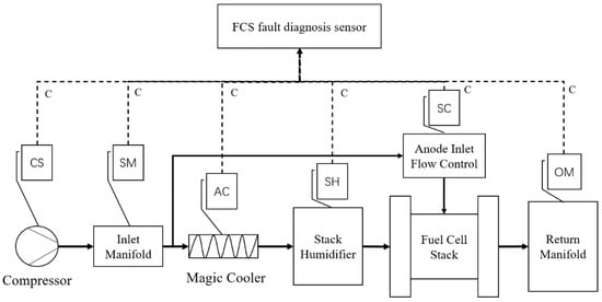 In Figure 2, we can find that the model FCS mainly includes seven elements. Moreover, the FCS can be seen as the machine which can transform fuel energy into electronic energy [3]. Therefore, in order to allow the chemical energy of the fuel to be converted into electrical energy more smoothly, safely, more effectively, and more economical in the FCS system, there is a need to select and set appropriate FCS fault-diagnosis sensor to check different elements in the FCS system. In Figure 2, we can also find that the FCS fault-diagnosis sensor can be divided in six parts (Compressor motor checking, Supply Manifold checking, Air Cooler checking, Static humidifier checking, Outlet manifold checking, and Stack cathode checking), and the detailed functions of these parts can be described as follows: