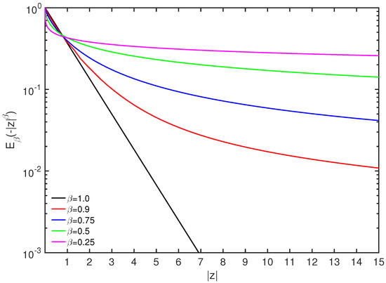 see [1,31,53]. The Mittag-Leffler functions reduce to an exponential for , and have a power-law decay for large t otherwise (see Figure 1). The diffusion coefficient can depend on in several ways [47,54]. For sufficiently strong turbulence, an isotropic scattering process in pitch angle can be assumed [54], i.e., , and the full solution can be expressed in terms of Legendre polynomials as [1,31,47]