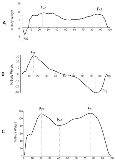 Figure 2. The typical pattern of the mediolateral (M/L), anteroposterior (A/P), and vertical planes of the ground reaction force. The horizontal line indicates the normalized stance phase, and the vertical line indicates the force percent body weight. (A) M/L plane: Fx1: first negative peak force, Fx2: second peak force, Fx3: third peak force. (B) A/P plane. Fy1: positive peak in anteroposterior, Fy2: negative peak. (C) Vertical plane: Fz1: vertical first peak force, Fz2: vertical second peak force, Fz3: vertical third peak force.
