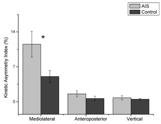 Figure 3. The absolute value of the kinetic asymmetry index (KAI) for three planes of the ground reaction force. The indices were significantly different (F = 38.31, p = 0.001), and the groups demonstrated a significant interaction (F = 5.41, p = 0.02). The mediolateral plane of the KAI was significantly greater in the AIS group than the control group (t = 2.23, p = 0.03). *: p < 0.05.