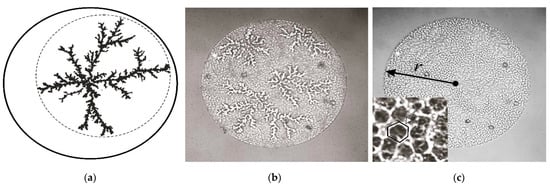 A dendrite lateral dimension was determined on the basis of the radius of its circumscribing circle (Figure 2a, dotted line). Unlike meshes, the dendrite lateral dimension grew as ri increased in a raw: for r1 it was equal to 18 um, for r2—53 um, for r3—61 um, for r4—140 um, and for r5—275 um. It is known that such dendrites appear as the result of 2D limited diffusion of particles aggregation [39].
