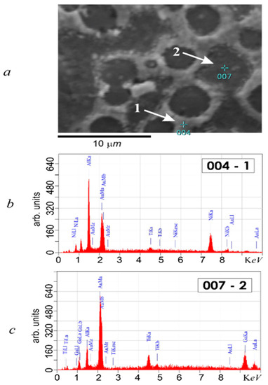 Electron microscope image of the mesh structure of the TiAlNiAu metallization surface—(a), EDS spectrums of the mesh wall, point 004, the arrow 1—(b), EDS spectrums of the mesh internal surface, point 007, arrow 2—(c).