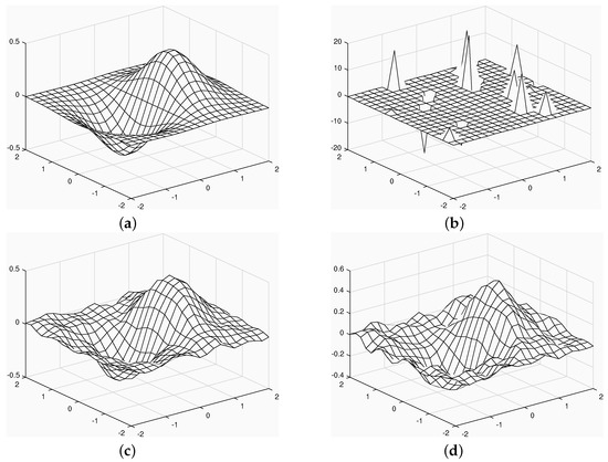 It can be seen that even in the case of extremely large external pollution, such as Example 3 in Figure 3b, the proposed method can obtain more accurate recovery data (Figure 3c) than the KROMP method (Figure 3d). In addition, the relative error (ReErr) results from Example 1 to Example 3 are shown in Table 1, and the better results have been bolded. It is obvious that the proposed method has smaller relative errors compared with the KROMP method, which verifies the effectiveness of the proposed method.
