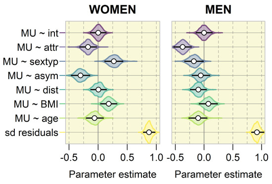 Density plots representing posterior distribution of estimated parameter values on a standardized scale for both sexes. MU = morphological uniqueness, int = model intercept, attr = facial attractiveness, sextyp = individual level of sexual shape dimorphism, asym = asymmetry, dist = distinctiveness, BMI = body mass index, age = age of the individual. Black error bars represent 95% compatibility intervals (CI) of the parameters, while circles denote the mean of each parameter estimate.