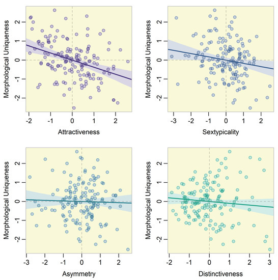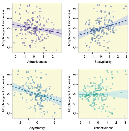 In men, facial attractiveness, sex typicality, and less so age and distinctiveness were negatively associated with morphological uniqueness. Asymmetry and BMI did not reveal any conclusive unidirectional relationship with MU. See Figure 3 for bivariate relationship between MU and four target fitness indicators in men.