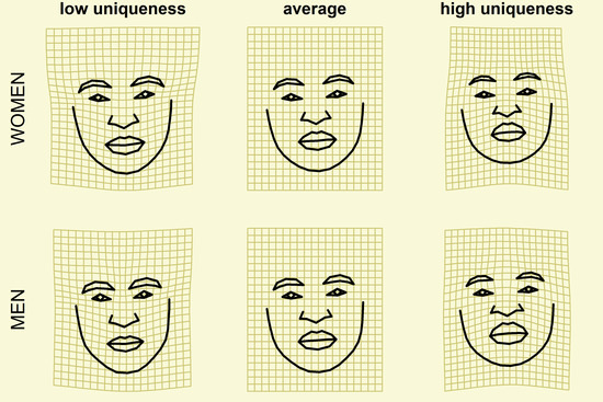 In case of facial morphology, the level of symmetry, sexual dimorphism (facial masculinity and femininity), and averageness (vs. distinctiveness) are traditionally viewed as important cues of facial attractiveness. In short, one can expect that more symmetrical, average, and masculine (in case of men)/feminine (in case of women) faces will be perceived as more attractive. Recent research, however, shows that this holds only in part. Interactions with the sex of the trait bearer, trait perceiver, hormonal status, health status, environment, and other variables must also be taken into account [34,35,36,37,38]. This study, though, does not aim at disentangling the complex dynamics of the abovementioned fitness indicators and their relation to biological quality.