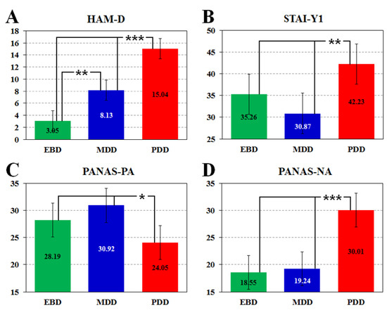 Severity of mood symptoms analyses: significant group main effect on (A) Hamilton Rating Scale for Depression (HAM-D), (B) State-Trait Anxiety Inventory—state form (STAI-Y1), (C) Positive Affect (PA) and (D) Negative Affect (NA) of the Positive and Negative Affect Schedule (PANAS). Asterisks: Significant post hoc comparisons (Newman-Keuls, p < 0.05). Note: EBD, euthymic bipolar disorder (EBD); MDD, major depressive disorder; PDD, persistent depressive disorder; * p < 0.05; ** p < 0.01; *** p < 0.001.