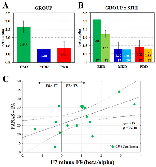 Pearson’s correlation analysis revealed significant positive associations between EBD participants’ left frontal beta/alpha ratio and their PANAS-PA scores (r15 = 0.58, p = 0.018): the greater the left frontal EEG beta/alpha amplitude (F7), the greater the positive affect (Figure 2C). No correlation was found for MDD and PDD patients.