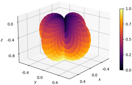 Plot of the antenna pattern function for the + polarization. The function is taken as the absolute value and is plotted in Cartesian coordinates x, y, and z. The z axis is oriented along the direction of the GW source. The color indicates the magnitude of the function, as described by the color bar. The antenna pattern function for the × polarization has the same shape, but is rotated by .