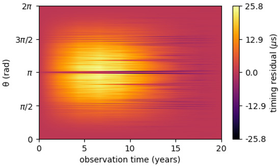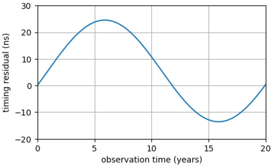 The function in Equation (14) is periodic with respect to both variables and t and, as can be seen from Figure 2, it rapidly oscillates with respect to . Moreover, due to the GW transverse nature, it is null when the GW source and the MSP are aligned with the observer, and assumes its global maximum for . For a given value of , as can be seen from Figure 3, the GW-induced timing residuals show a sinusoidal behavior. The GW angular frequency determines its period, while the factor gives an upper limit on timing residuals that can be induced by a GW emitted by an SMBHB. For Hz, which is in the frequency range of GWs detectable by current PTAs, the typical value of the GW amplitude turns out to be about . Therefore, one has ns. Unfortunately, there are very few MSPs that can be timed with such high precision, so at the moment it is unlikely to detect single SMBHBs by pulsar timing.