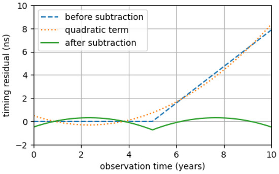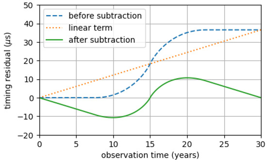 where sign is the sign function, which is positive if the argument is greater than zero and negative otherwise. Moreover, as explained in Section 4.3, the linear contribution in the timing residuals can be subtracted to remove the uncertainties in the MSP period (see Figure 7).