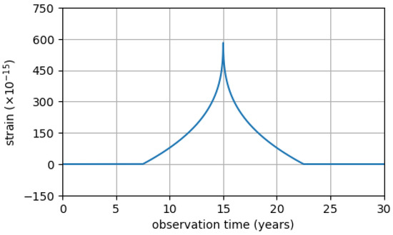 where is the BWM amplitude, is the observation time of the BWM and is the Heaviside function, which is null before the burst (i.e., for ) and it is unitary after it (i.e., for ). Taking into account Equations (6) and (24), by integrating Equation (8) results [49]: