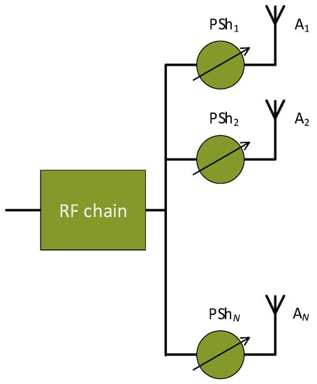 The basic idea of analog beamforming is to control the phase of each transmitted signal using inexpensive phase shifters. Analog beamforming affects the gain of the antenna array, thus improving its coverage. Only one beam can be generated per set of antenna elements, in contrast to a digital beamforming scheme. The antenna gain caused by analog beamforming partially compensates for the high millimeter-wave path loss. Therefore, analog beamforming is a must for 5G millimeter-wave frequencies. Figure 1 shows a block diagram of the analog scheme of beamforming [6].