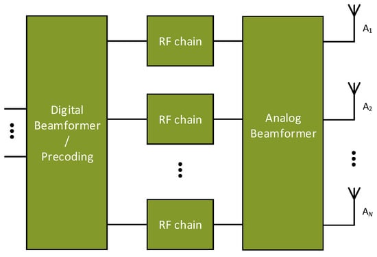Hybrid beamforming is a combination of analog and digital beamforming. It has the advantages of both methods. This method requires fewer RF chain (radio frequency) than digital beamforming. It is also more flexible than analog beamforming. Therefore, it is assumed that 5G base stations will use some realization of hybrid beamforming [7]. The block diagram of the hybrid beamforming scheme is shown in Figure 3 [6].