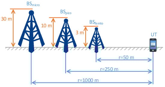 To simulate a picocell, the following scenarios were used: mmMAGIC_UMi_O2I, mmMAGIC_UMi, 3GPP_38.901_UMi_O2I, 3GPP_38.901_UMi. These scenarios are normally used to model channels in a micro-urban environment to ensure both entirely external communication and data transfer from buildings to the external BS. The BS antenna was attached at the height of 10 m, and the UT at the height of 1–1.5 m. The cell radius of the BS was 200 m.