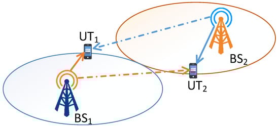 Two cases were considered: when the user was placed at the edge of the zone without interfering signal (LOS/NLOS scenarios) and with interfering signal (LOS/NLOS scenarios). The first included one BS and one UT. In scenarios with two BSs, the second BS2 was located at a distance of 2r. Figure 7 shows the signal propagation model for the second case with two BSs and one UT.