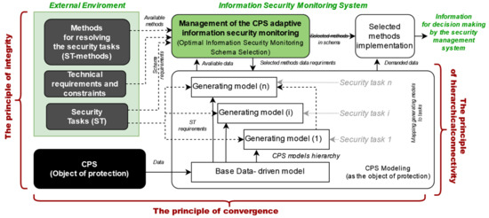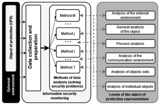 At the same time, the variety of security tasks leads to the requirement of a large number of monitoring methods. Modern methods for solving ISMS security problems have different efficiencies in relation to the different objects and/or conditions. In addition, these methods require prompt correction of their set in the event of external and internal changes and, often, the joint use of several methods to solve one security problem. A cyber-physical system, as an object of protection, is a complex dynamic system that does not lend itself well to analytical description and modeling [21]. The general theory of systems and the systems approach describe the system features as hierarchy, integration, and connectivity [22]. Under these conditions, the information security monitoring subsystem faces two priority tasks. The first is to ensure the collection and preparation of data from the protected object in all the above aspects. The second is to provide and support methods for analyzing this data in order to solve security problems at all levels of object presentation: From individual components to industrial CPS as a whole, taking into account the context of the external environment, the convergence, and interconnections of the components.