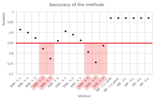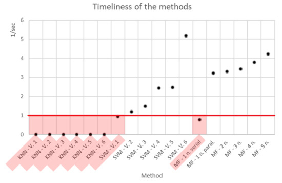 The bank of methods for solving the problem was formed on the basis of methods well described in the sources, the characteristics of which are available for evaluation, in particular, on the basis of references [36,37,38,39]. The solution bank included methods based on two well-known industry classifiers of network traffic: The classifier k-nearest neighbor (KNN 1–6) and the support vector machine (SVM 1–6) in various modifications (six modifications of each classifier), as well as the multifractal (MF) analysis method in various implementations. For the latter, the characteristics of five different implementations were included, taking into account data parallelization, starting from one computational node.