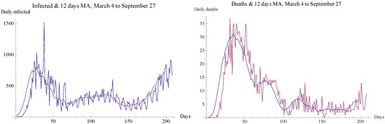 Daily infected and death numbers and 12-day moving averages in Portugal.