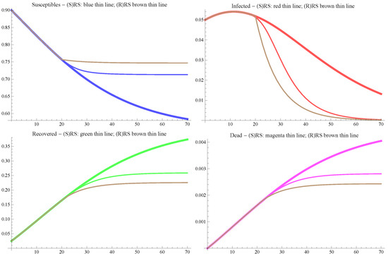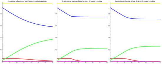 (On the Lie symmetries for ODE models with regime switching). There are at least two ways of considering symmetries on the model developed in this work. The first and more simple one is the usual reversibility in time for ODE. In fact it is clear from the expression of an ODE in integral form in Formula (19)—using as the variable change—that the generalised solution of a ODE for a regime switching model proved using Carathéodory’s theorem is reversible in time. The second and profound one is related to the Lie symmetries for the differential model in Formula (5) with added regime switching as studied in this work. Lie type symmetries for ODE in general are the object of several reference works, for instance in [53]. For the SIR and the SI(RD) models, Lie symmetries were presented in [54,55], following the general proposals of using Lie symmetries in epidemiology developed in [56,57]. The study of Lie symmetries for ODE with regime switching remains to be done. A natural approach is to use the ideas of bifurcation theory, as masterfully developed in [58,59].