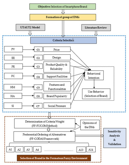 - The extant literature within our limited search shows a plethora of work that aims to understand consumer behavior in relation to smartphone selection. However, use of a holistic perspective based on MCDM is limited. Previous studies exist that have used MCDM methods for the comparative analysis of smartphones (for example, [18,19,20,21,22]). However, studies on smartphone selection considering the brands based on theoretical perspective, such as UTAUT2, is rare in the literature.