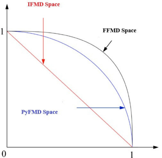 For simplicity, let us consider that an FFS is denoted by F = (μ_f,ϑ_f), with the usual definitions being presented in the form provided above. The following figure (Figure 2) depicts the difference among IFS, PyFS, and FFS, in terms of membership degrees (MD).