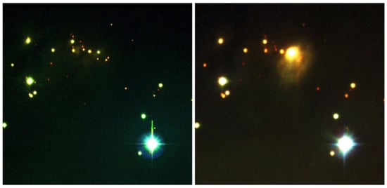 - Miller, A.A.; Hillenbrand, L.A.; Covey, K.R.; Poznanski, D.; Silverman, J.M.; Kleiser, I.K.W.; Rojas-Ayala, B.; Muirhead, P.S.; Cenko, S.B.; Bloom, J.S. Evidence for an FU Orionis-like Outburst from a Classical T Tauri Star. Astrophys. J. 2011, 730, 80. [Google Scholar] [CrossRef]