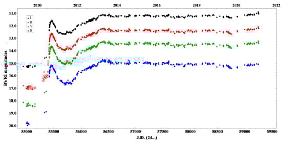 Data collected from photometric observations of V2493 Cyg show that the outburst registered in 2010 has been going on for at least eleven years. The light-curves of V2493 Cyg during the period June 2008–February 2021 are plotted in Figure 2. The filled diamonds represent our CCD observations (Semkov et al. [15,25,32,33] and the present paper), and the open circles observations from the 48 inch Samuel Oschin telescope at Palomar Observatory [16].