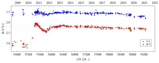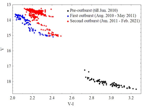 On the other hand, there is a significant difference in the values of V-I and R-I indexes during the two peaks of brightness (Figure 4). During the first local maximum (August 2010–May 2011) the star was bluer than during the second maximum (June 2011–February 2021). The difference in the V-I indexes at the time of the two peaks in brightness reaches 0.2 magnitudes for the same values of V magnitude. Such a phenomenon can be explained by a gradual expansion of the emitting region around the star.