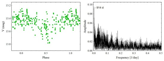 We carried out a periodicity search in the light variations of V2493 Cyg by the software package Period04 [36]. Such studies are usually severely hampered by the large amplitude photometric variability of the FUors due to the variable accretion rate. In the case of V2493 Cyg, we have been helped by the long photometric plateau during the recent years. Therefore, we considered the star’s data received after February 2013, when the brightness of V2493 Cyg varies around some intermediate level in maximal light. Our time-series analysis indicates a 914 ± 10 day period. The periodogram of the star and its phase-folded V light curve is displayed in Figure 5.