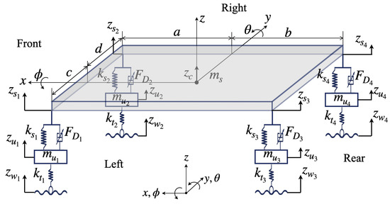 where , , and denote the sprung mass, the pitch inertia, and the roll inertia, respectively; , , , , and denote unsprung mass, the passive damping, the stiffness of the suspension spring, the passive stiffness of the damper, and the tire stiffness, respectively, at suspension i; and a, b, c, and d denote the distances between the center of gravity of the vehicle full-body and the centers of the two wheel axes in the front, rear, left, and right sides, respectively.