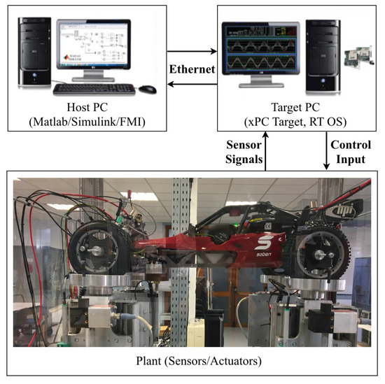 To demonstrate the applicability of the concepts presented in this paper, we implemented a prototype and performed a set of experimental and simulation tests. The semi-active suspension model and the hybrid sliding mode controller are both implemented as Functional Mock-Up Units (FMUs) conforming to the Functional Mock-Up Interface for embedded systems (eFMI) [29]. Our implementation allows model and controller re-usability and provides a generic way of integrating models and control software into embedded ECUs. The prototype implementation is validated through a set of experimental tests using 1/5 INOVE Soben-car test bench from GIPSA-Lab at University of Grenoble Alpes (see Figure 2). The test bench has four Electrorheological dampers of type Fludicon and four amplifier modules of type CarCon2; the input of each amplifier module is a PWM signal. Four servomotors of type OMRON are connected to the wheel–axle assemblies to simulate the input road profiles. Matlab/SimulinkTM and FMU control interfaces are used on the Host PC to perform simulation tests on the suspension model and the sliding mode controller. Target PC is used to compile and execute the FMU blocks in real-time simulation.