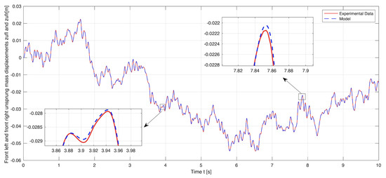 Figure 4, Figure 5, Figure 6, Figure 7 and Figure 8 demonstrate the experimental and simulation results of the model validation. The vertical displacements of the front and rear unsprung masses (i.e., the wheel–axle assemblies) are presented in Figure 4 and Figure 5. The vertical displacements of the front and rear sprung masses (i.e., the quarter car bodies) together with the vertical displacement of the full-car body centroid are presented in Figure 6, Figure 7 and Figure 8. The experimental data represent the real behavior of the test bench. The simulation results show that the implemented full-car suspension model is highly accurate and precisely captures the suspension dynamics presented in the physical system.