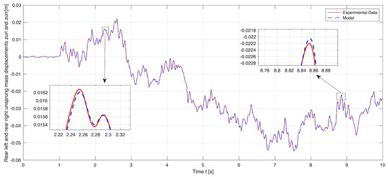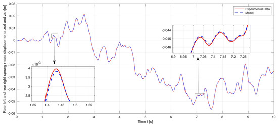 Model simulation versus experimental data: The vertical displacements of the rear quarter-car bodies.