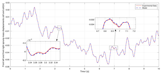 Model simulation versus experimental data: The vertical displacements of the front wheel-axle assemblies.