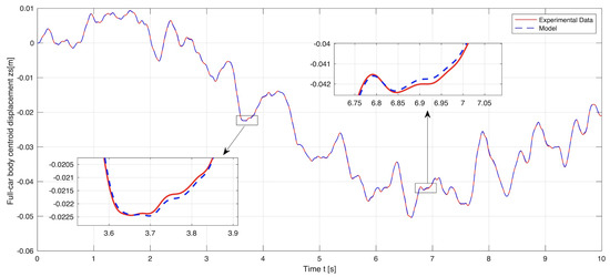Model simulation versus experimental data: The vertical displacement of the full-car body centroid.
