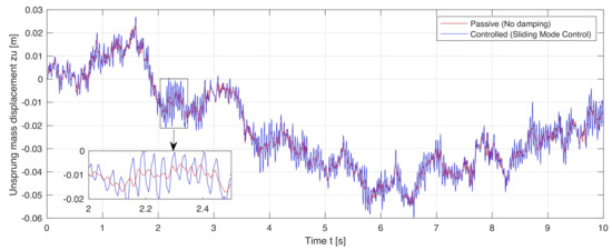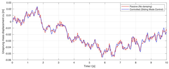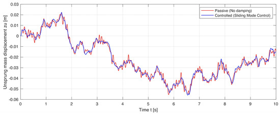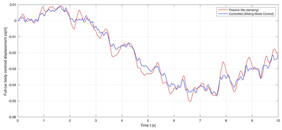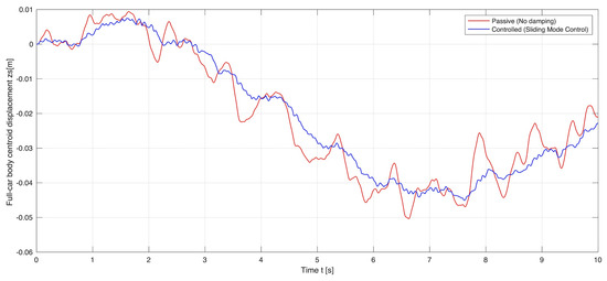 The simulation results are shown in Figure 9, Figure 10, Figure 11, Figure 12, Figure 13 and Figure 14. The passive and controlled suspension of the full-car body and the four wheel–axle assemblies are compared for three different control objectives: (a) when (i.e., full road handling), (b) when (i.e., full ride comfort), and (c) when (i.e., 40% road handling and 60% ride comfort). When applying the sliding mode control for full ride comfort, the vertical displacement of the full-car body decreases. Similarly, when applying the sliding mode control for full road holding, the vertical displacements of the four wheel–axle assemblies decrease. When the sliding mode control is applied simultaneously for both road handling and ride comfort, the vertical displacements of the full-car body and the wheel–axle assemblies decrease.