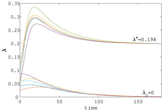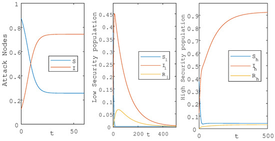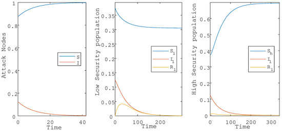 Since then . Therefore, it can be concluded that the system will be infection-free with time. Hence, the trajectories of the solution converge to , as shown in Figure 3. Moreover, we notice that the attack node population is invariant with respect to the reversing symmetry transformation described in Lemma 1 for a small value of .