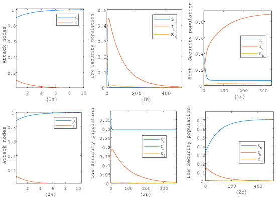 Class 1: the solutions of system (6), when . Class 2: the solutions of system (6), when , in which the values of the parameters are set as in Example 3. Sub-figures (1a,2a) simulate an attack population, and sub-figures (1b,2b), (1c,2c) simulate the target population with both low-security level and high-security level, respectively.